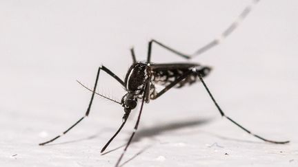 Un moustique tigre sur le mur d'une maison à Montreuil,dans la banlieue Est de Paris,le 18 août 2025. (MARTIN LELIEVRE )